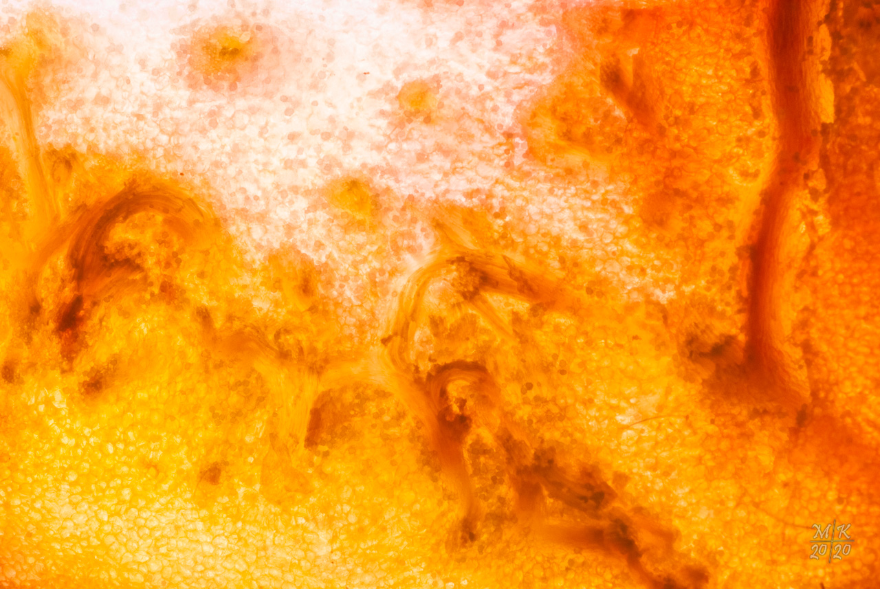 Kaum war der Kuchen im Ofen, hatte ich bereits die Vorarbeiten für die Aufnahmen erledigt und schaute durch den Winkelsucher. Wahrheitsgemäß vermelde ich: es hat mich aus den Pantoffeln gehauen. Denn der scharfe Blick ins Innere des Rhabarbers verrät erstaunliche Einzelheiten, die mit bloßem Auge kaum wahrzunehmen sind. Vor allem im Gegenlicht offenbaren sich fantastische Muster, groteske Strukturen und berauschende Farben.