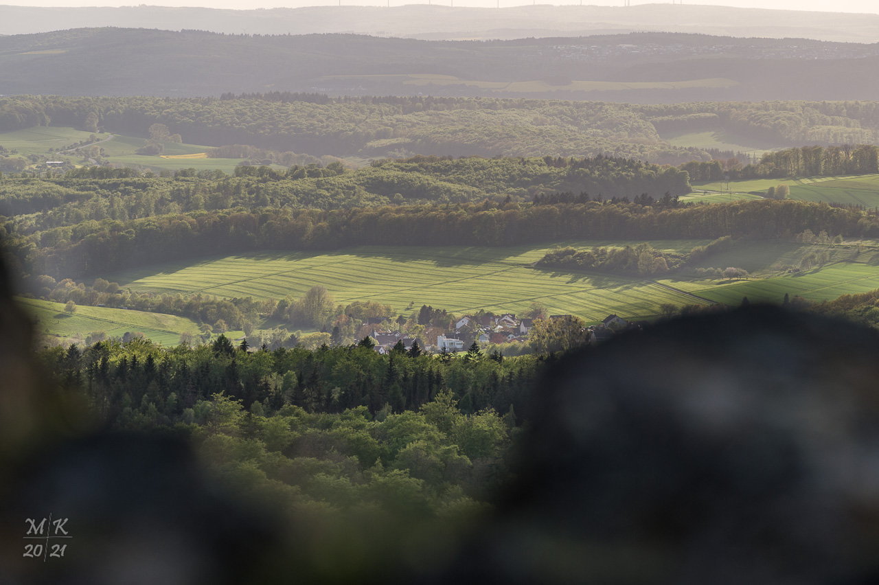 Der Zacken ist eine 640 Meter hohe Erhebung aus Schiefer im Gebiet des Ortsteils Oberems in der Gemeinde Glashütten. Da er steil und felsig emporragt, ist er gleichermaßen für Kletternde und als Ausflugsziel interessant. Unser Besuch am Spätnachmittag bei reichlich bewölktem Himmel bescherte uns wechselnde Lichtstimmungen mit teils recht romantischem Gepräge.